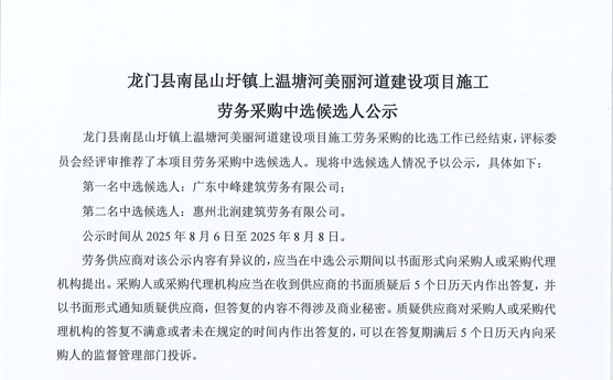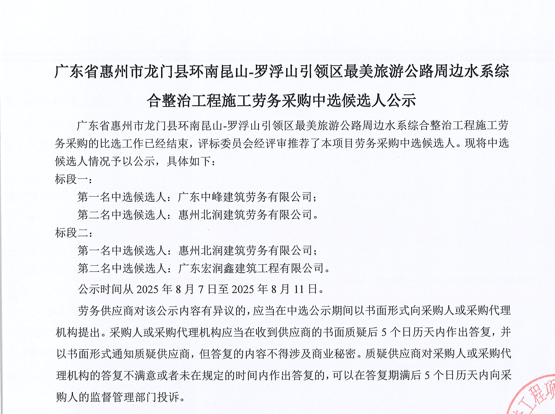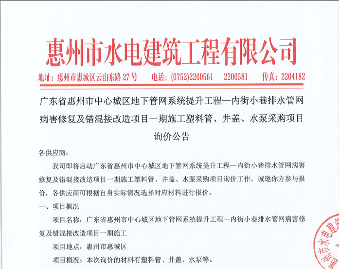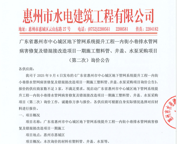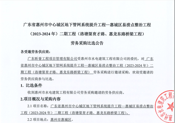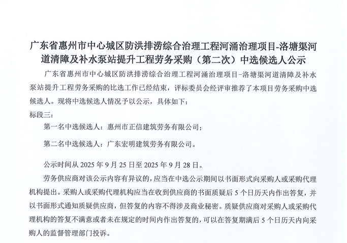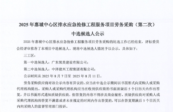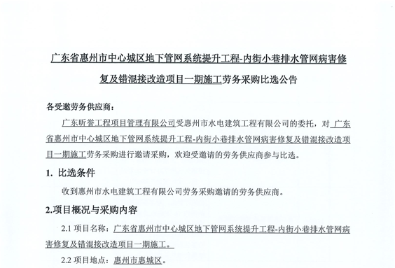 廣東省惠州市中心城區(qū)地下管網(wǎng)系統(tǒng)提升工程-內街小巷排水管網(wǎng)病害修復及錯混接改造項目一期施工勞務采購(第二次)中選候選人公示……